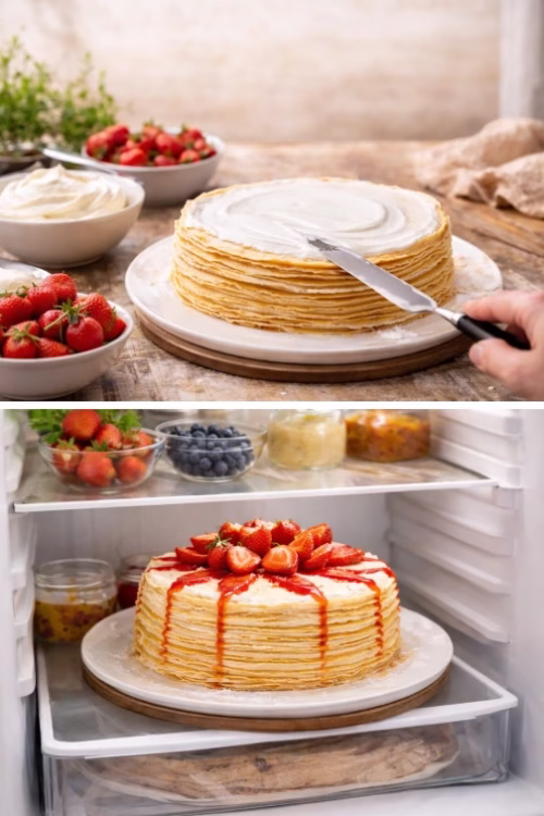 - Apila las crepas y deja enfriar 15–20 minutos antes de armar.