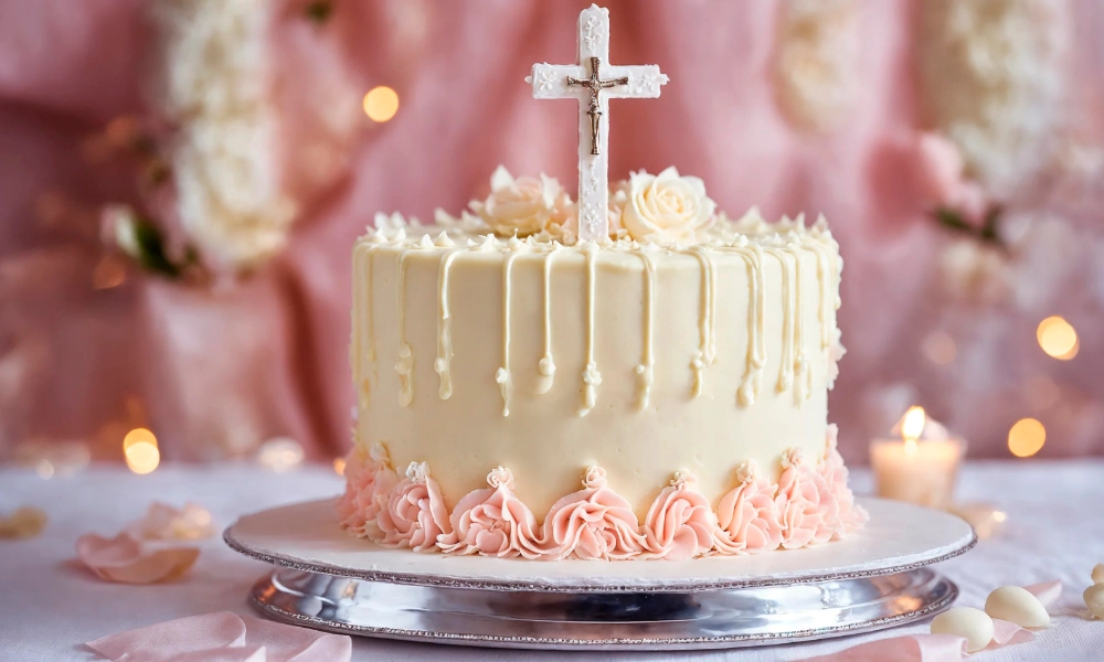 Un pastel blanco con una cruz o flor natural puede ser igual de impactante. Ideal para eventos íntimos y minimalistas. Este tipo de diseños suele llevar cobertura de crema batida o glaseado liso, lo que abarata costos sin sacrificar belleza.