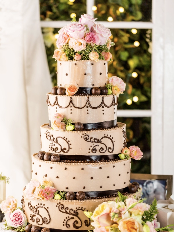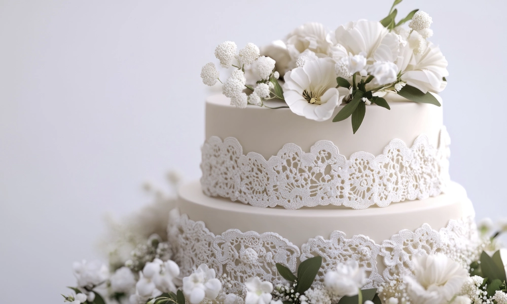- Decoración común: Rosas naturales, encaje de azúcar y perlas.