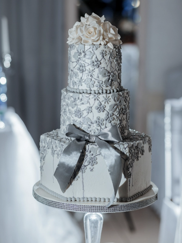 - Decoraciones frecuentes: Moños plateados, perlas comestibles y flores blancas.