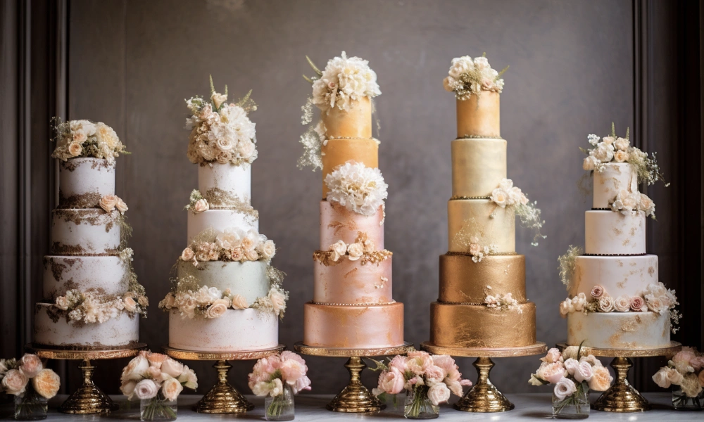 - Estilos populares: Pasteles de dos o tres pisos con detalles metalizados.