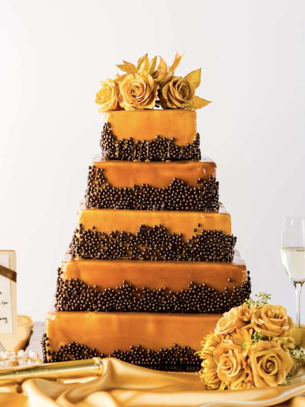 Las bodas de oro celebran 50 años de matrimonio. Por lo tanto, es una ocasión que merece un pastel dorado, elegante y lleno de significado. Normalmente, los diseños incluyen detalles metálicos, hojas de oro comestible y flores blancas o amarillas.