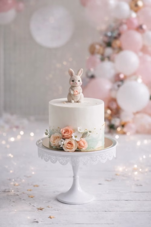 Aquí funcionan muy bien los diseños suaves: animalitos tiernos, mariposas, flores pequeñas, ositos, nubes, arcoíris en tonos apagados o un número uno grande. Muchas familias prefieren un pastel principal y, además, un mini pastel para las fotos del primer cumpleaños.