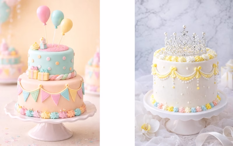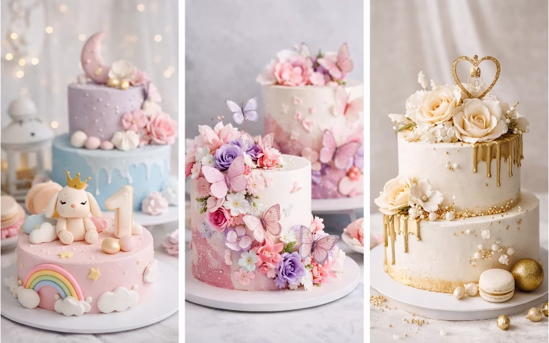 Son una apuesta segura. Rosa suave, lila, celeste, crema, blanco y toques dorados forman combinaciones delicadas que funcionan para muchas edades. Además, este tipo de pastel se adapta bien a temas de mariposas, nubes, flores, princesas o arcoíris discretos.