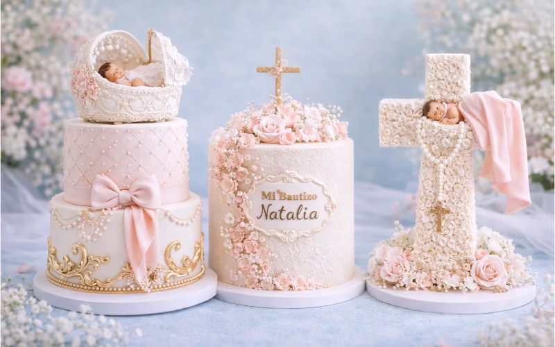 Entre los elementos que mejor funcionan están las cruces discretas, lazos, perlas, flores pequeñas, alas de ángel sutiles o un topper sencillo. Además, un pastel para bautizo casi siempre luce mejor cuando se evita la saturación y se cuida la armonía visual.
